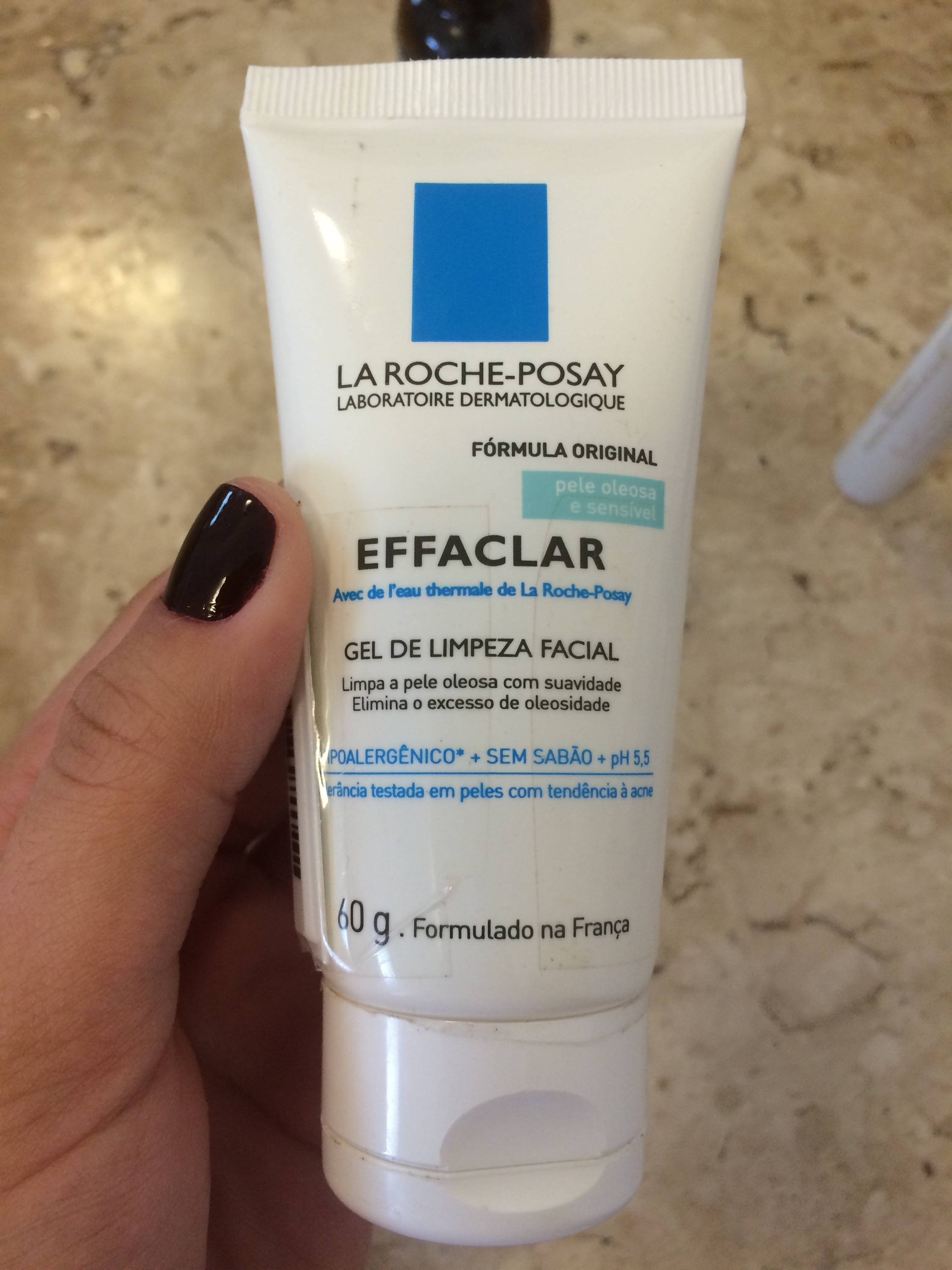 A primeira coisa que faço quando levanto, é lavar o rosto com esse gel de limpeza, da La Roche. Ele limpa a oleosidade da pele produzida durante o sono, e neutraliza o PH